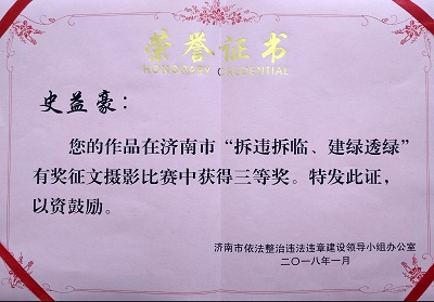 史益豪同学的作品《开启美好生活新时代 泉城百姓获得感满满》荣获三等奖,史益豪同学受到活动主办方的通报表彰。
