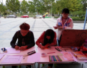 活动准备阶段,志愿者在经管楼前布置摆摊,拉起横幅,向过往同学们发放有关国际盲人节的宣传资料和盲人生活介绍。活动展开阶段,同学们与志愿者一起参加小游戏,从中体会盲人日常生活的小细节与生活的心态。在创意作画游戏过程中,三人一组进行创意作画,一个人根据提供的画尽可能的描述这幅画,另两个人戴上眼罩在纸上配合作画。与此同时,心灵画家游戏也进行得十分顺利,志愿者在现场指定某一物体,让游戏者戴上眼罩在白纸上作画,选出最逼真的一副并赠送小礼品。活动后续阶段,有意愿的同学在便签上写下自己的体验感想、鼓励盲人的话和自己的活动感触。值班人员收集好便签,连同绘画作品一起张贴在展板上。最后,同学们对盲人生活的不易与艰辛表示同情,纷纷表示珍惜现在的生活。